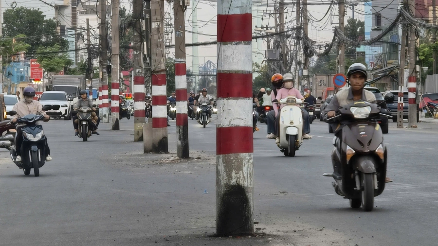 Upgrades to Nguyen Thi Dinh Street, which connects Ho Chi Minh City's largest interchange An Phu and My Thuy roundabout in the former Thu Duc City, are nearing completion but 200 utility poles still remain in the middle of the road.